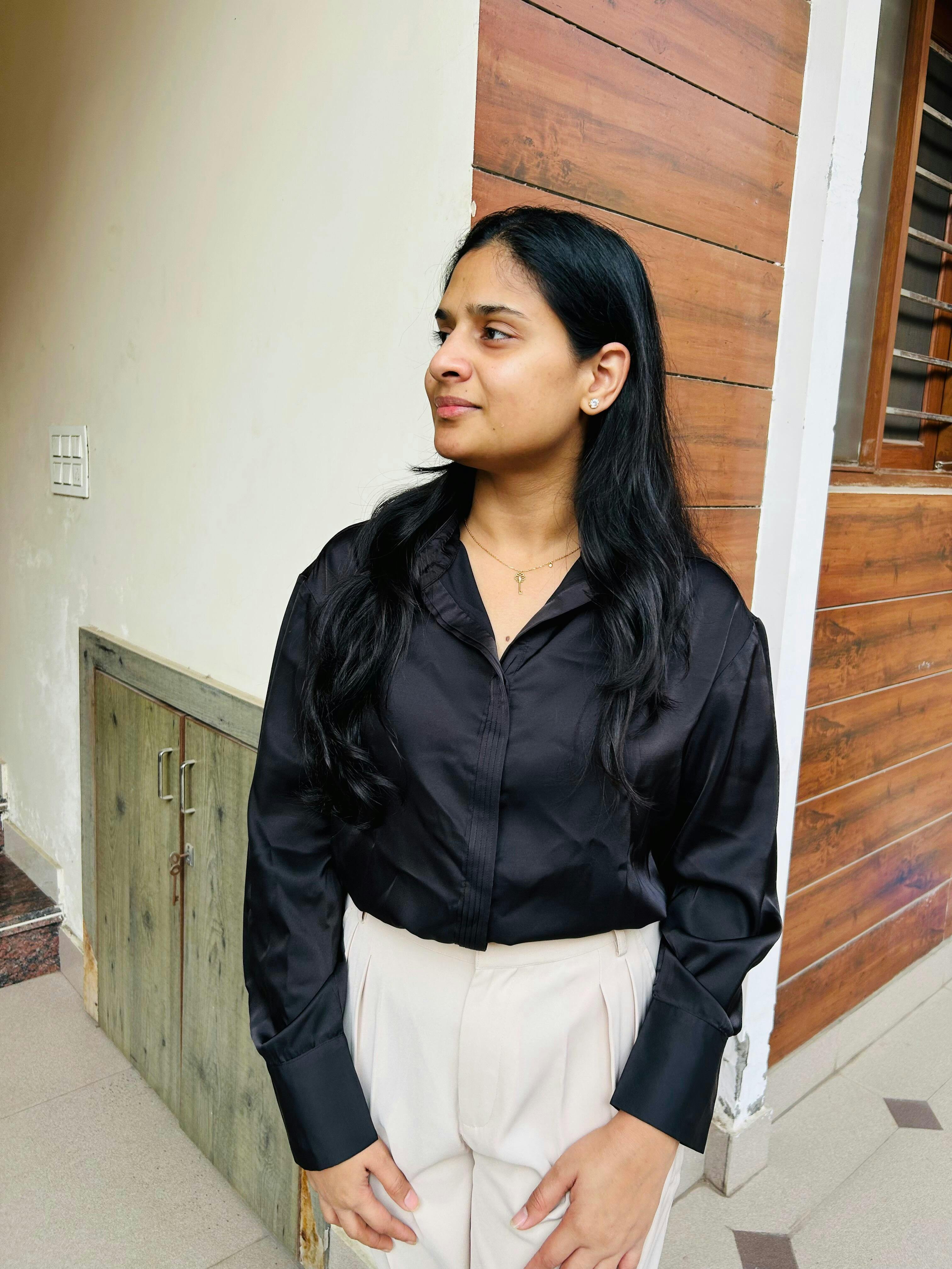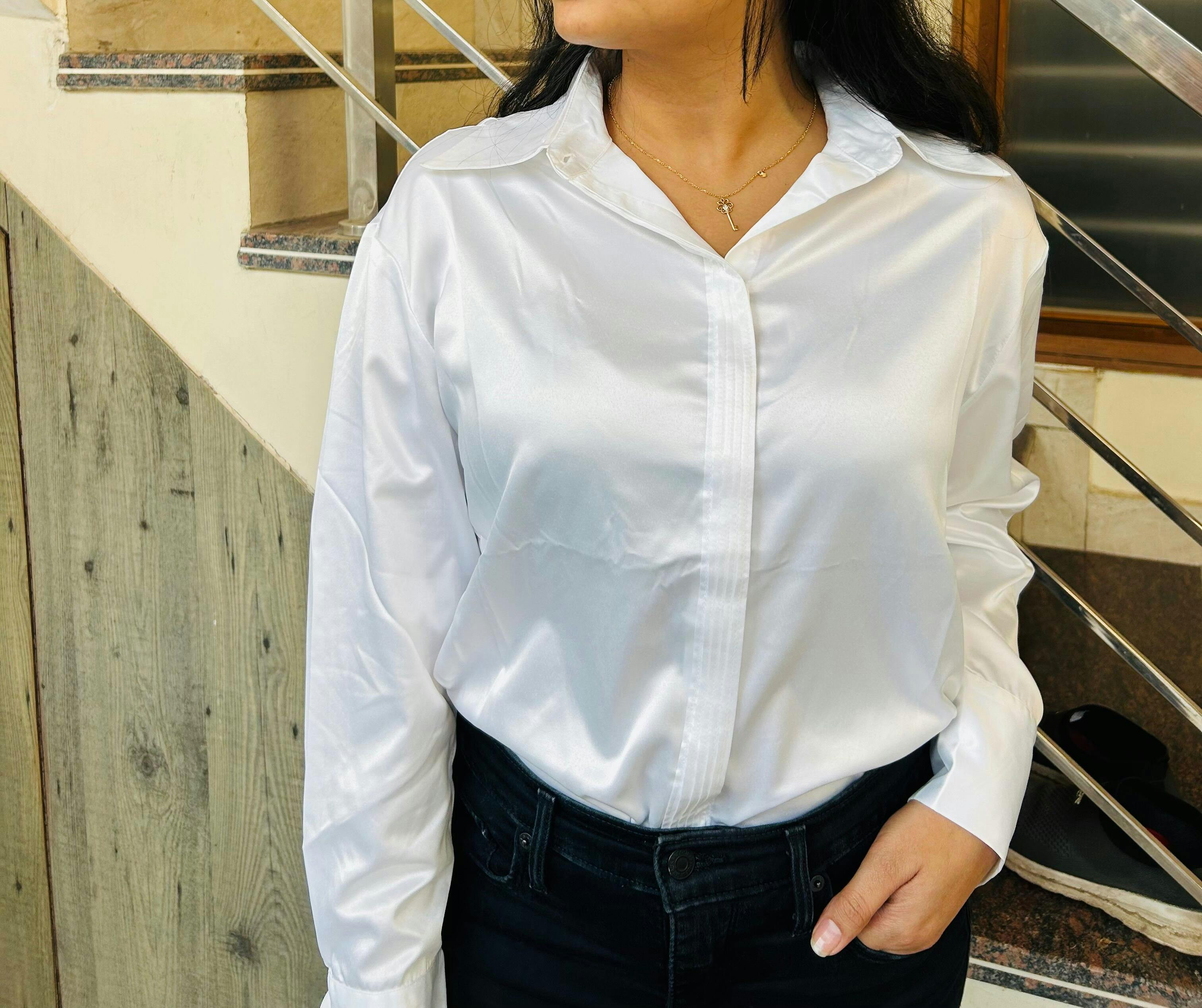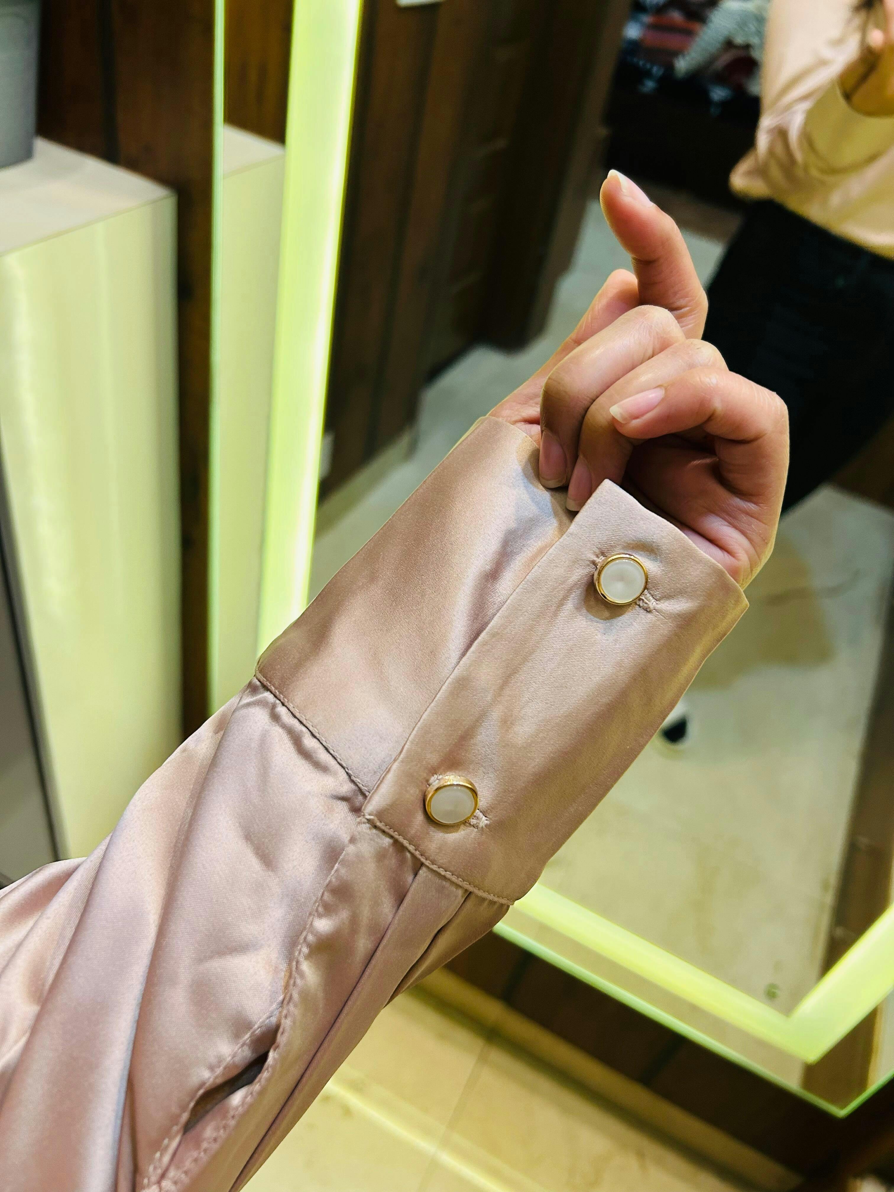 Buttons: Premium pearl buttons with gold-tone-rim placed on the top button and cuffs. The rest are concealed for a polished front.