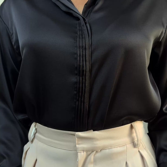 Premium Satin Relaxed Pintuck Shirt | Raven Black